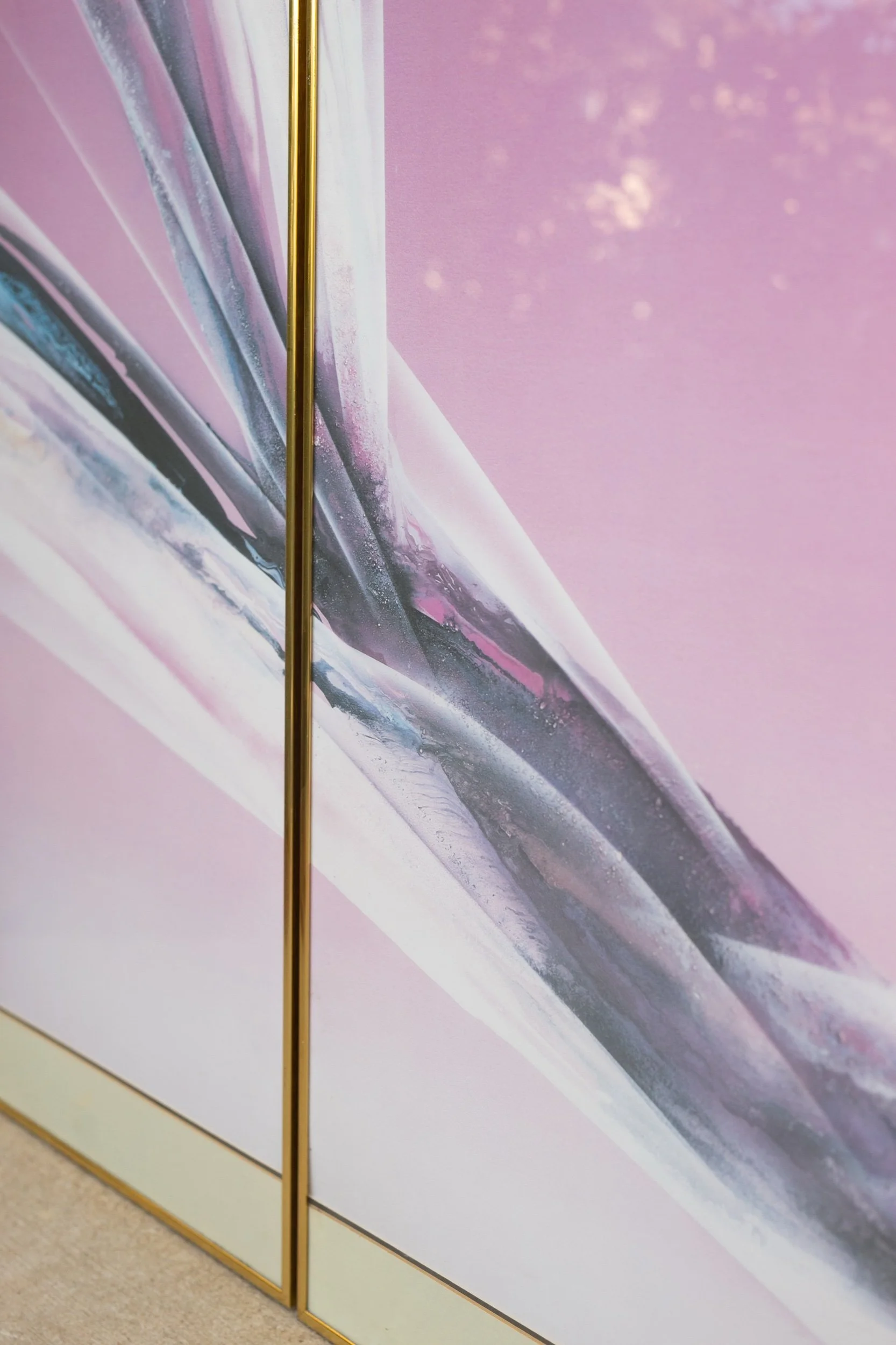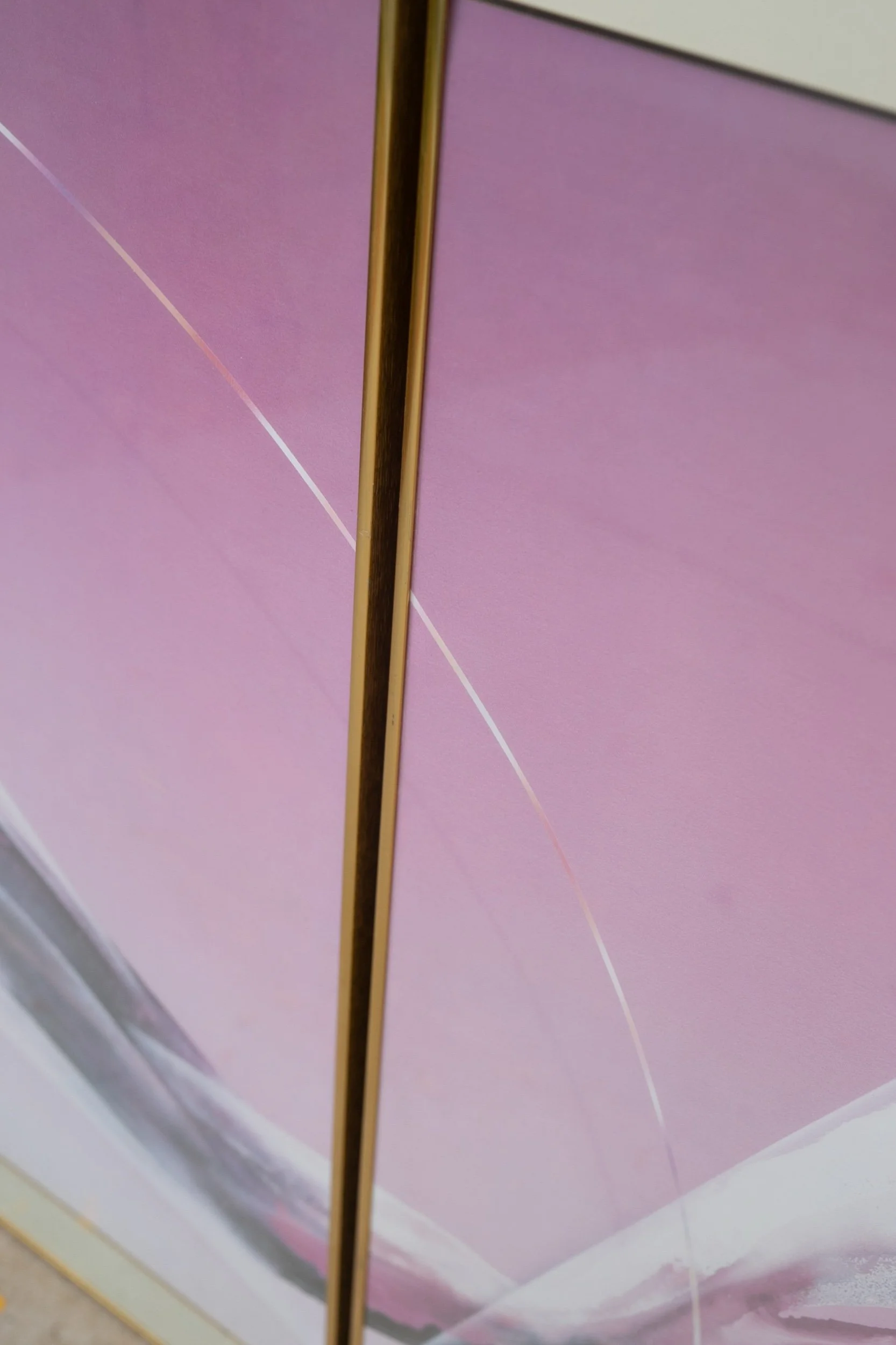 This example, likely from the 1980s–1990s, captures her signature style: geometric movement softened by flowing curves and layered hues of purple, gray, and black. Each of the three framed panels forms part of one continuous artwork, giving it both scale and presence.